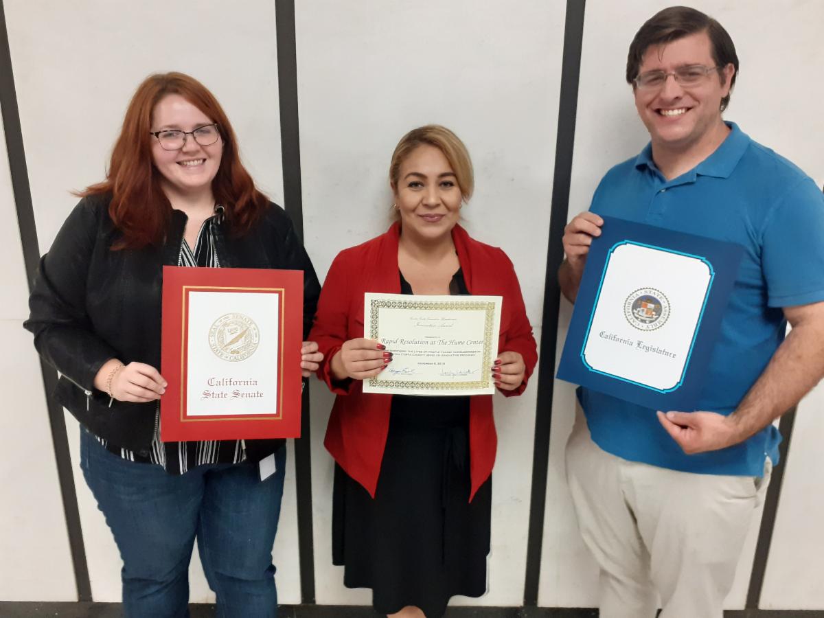 Bertha Lopez, the Program Coordinator of Hume's Housing Support Services Program, accepted the award for Best Innovative Program from the Contra Costa Council on Homelessness at the County Board of Supervisors Meeting on behalf of The Hume Center. Bertha, and her Rapid Resolution Specialist Samantha Quinn, have developed this new program over the last year in close collaboration with Contra Costa's Health, Housing, and Homeless (H3) Division.